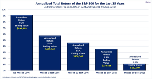 The mix of geopolitical uncertainty and shifting inflation expectations has lifted volatility. That is not a sign markets are “broken”—it reflects markets that are continuously updating prices as new information arrives.In these moments, headlines can tempt investors into short-term moves. A recurring challenge is that large up days often cluster near large down days, which can make exit-and-reentry decisions difficult in real time. It is virtually impossible to time markets effectively. Discipline is the critical factor, removing emotion and focusing on the plan. The graph below demonstrates that the winning factor is normally patience.