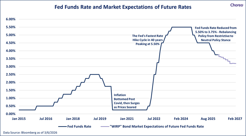 This is why Fed policy is as much about judgment and communication as it is about data. Markets don’t just react to what the Fed does — they react to what the Fed signals it might do next. Often by the time an interest rate move occurs, it is entirely anticipated by markets. The chart below illustrates the historical fed funds rate, as well as the future path of rates expected by markets as of March 6th.