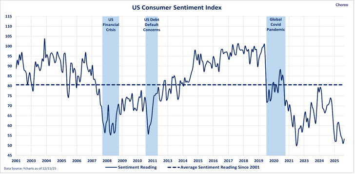 4. Consumer strength: Consumer spending in the U.S. is the predominant economic force. This spending has remained strong in a wide variety of periods (including during the COVID pandemic-led recession). Signs of weakness for consumers have emerged, albeit inconsistently across demographic segments, with lower-income households beginning to feel inflationary pressures while higher-income households have generally shown continued strength. Consumer sentiment has been reflective of these challenges and remains depressed as shown in the chart below. Change for the consumer and their spending habits could have profound implications for the broader economy, making it a high priority item to watch in 2026.