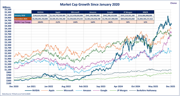 3. Nvidia (and the other 6): In January of 2020 amidst the COVID pandemic, Nvidia had a market capitalization of $150 billion. Very few outside of the technology or investment landscape had even heard of the company. Today, companies valued around $150 billion include Capital One, Boeing, Pfizer and Adobe, generally considered household names. As of December 9, 2025, Nvidia has a market capitalization of $4.5 trillion and is the largest publicly listed company in the world. It has led a group of large companies affectionately known as the Magnificent 7 (“mag 7”), including Alphabet (the parent company of Google), Apple, Microsoft, Meta (the parent company of Facebook and Instagram), and Tesla. Nvidia didn’t exactly come out of nowhere, but its semiconductor chips have now become essential to the ongoing AI boom. As of the end of November, these companies represent roughly 35% of the S&P 500. Naturally, how they perform can impact broader market returns. Nvidia alone accounts for just under 8% of the index. In other words, if these companies continue to grow and do well, markets could react favorably, and vice versa. Their size alone (in excess of $1 trillion, which was believed to be an almost unattainable benchmark not too long ago) makes them worth attention in 2026.
